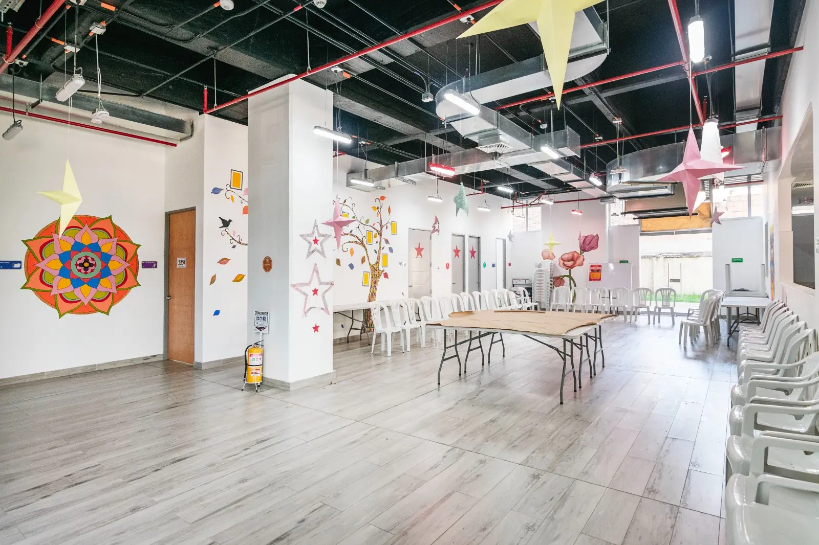 Entre abril y mayo de 2024, se ejecutaron los trabajos de acabados para el Centro de Desarrollo Cultural María Goretti, cubriendo un área de 800 m². Las actividades incluyeron la instalación de cielos rasos en PVC y superboard, así como la construcción de divisiones livianas en drywall y Superboard, logrando espacios funcionales y estéticamente adaptados a las necesidades del edificio.